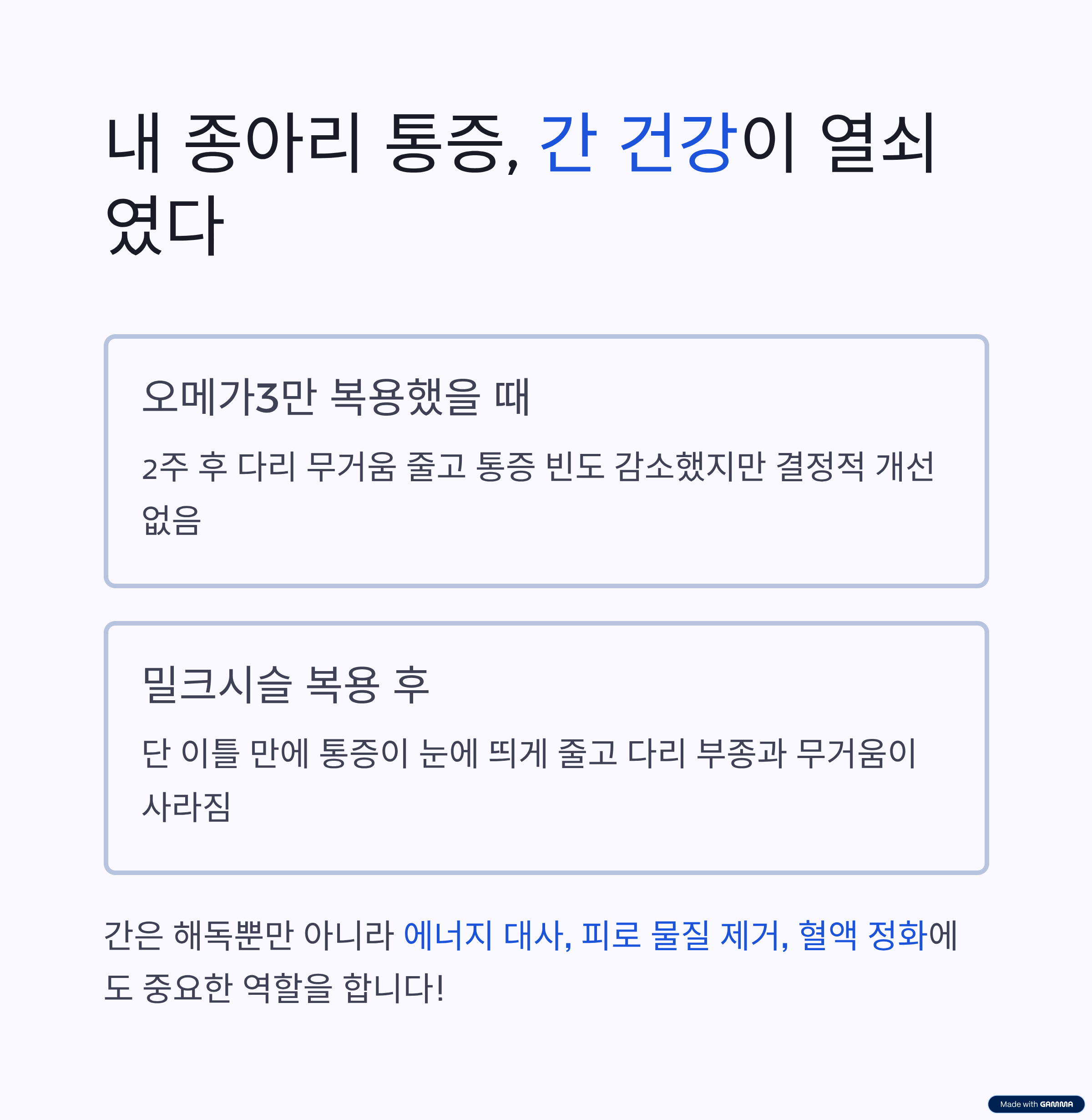저 역시 종아리 통증으로 고민하다가 오메가3와 밀크시슬을 각각 복용해본 경험이 있습니다.