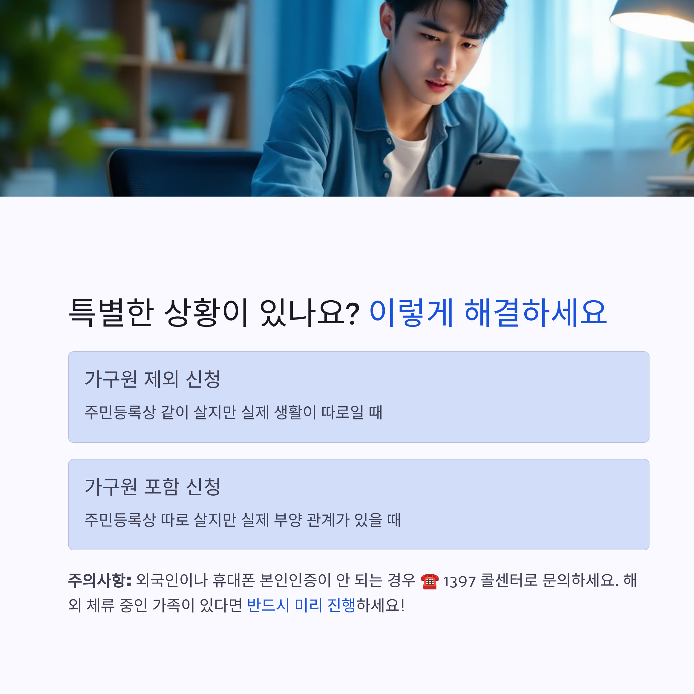 -미성년자: 가구원 수에는 포함되지만 동의는 불필요-본인인증 불가: 외국인·명의 문제 시 콜센터 문의-기한 내 미완료 시: 신청이 자동 종료됩니다 ❗-가족이 해외 체류 중이라면 미리 진행 — 시간 촉박 시 재신청 불가