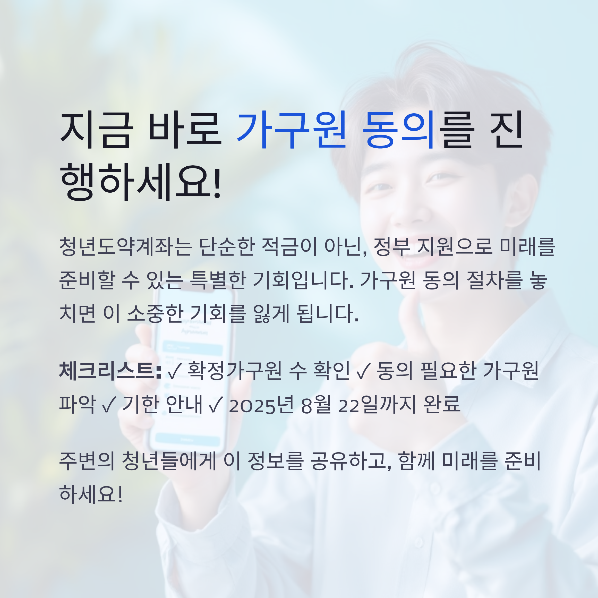 청년도약계좌는 단순한 적금이 아니라, 정부 지원을 받을 수 있는 기회입니다.하지만 가구원 동의 절차를 놓치면 그 기회를 잃을 수 있습니다.특히 가족 구성원 중 해외 거주자, 고령자 등 인증이 어려운 분이 있다면오늘 바로 연락해서 미리 진행하세요.